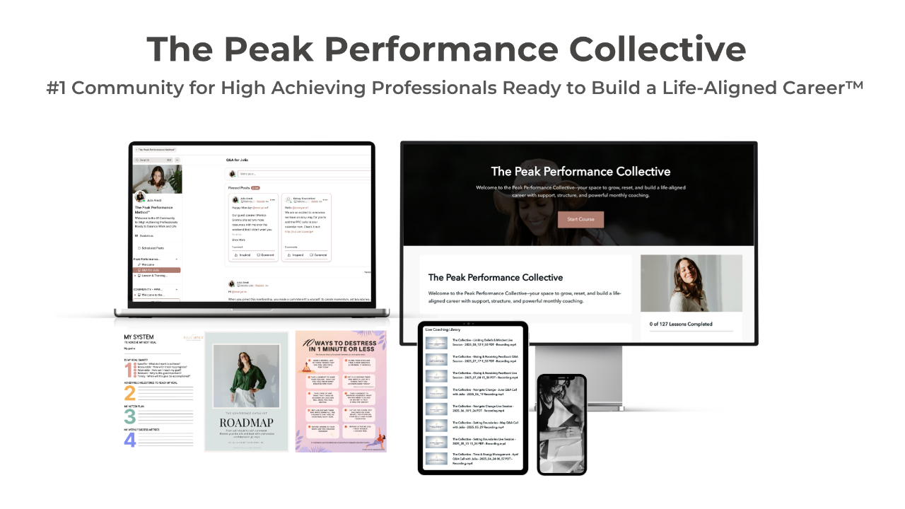 When you join The Peak Performance Collective, you get everything you need to create the structure, clarity, and confidence to thrive at work without the burnout.